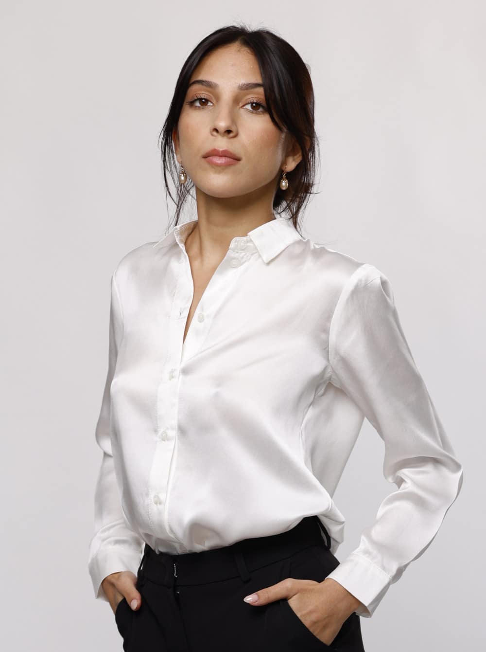 Our button-up blouse has a relaxed fit on the body when worn. If you are between sizes, we recommend sizing up for this garment.